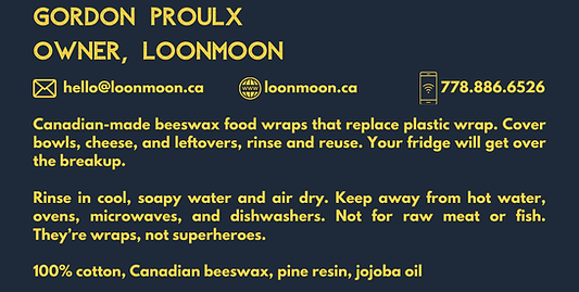 LOONMOON is a small BC- based brand producing Canadian-made beeswax food wraps. They’re a reusable, plastic-free alternative to cling film and zip bags, made with Canadian beeswax on high-quality cotton. They keep food fresher, reduce kitchen waste, and last 9-12 months with simple care.